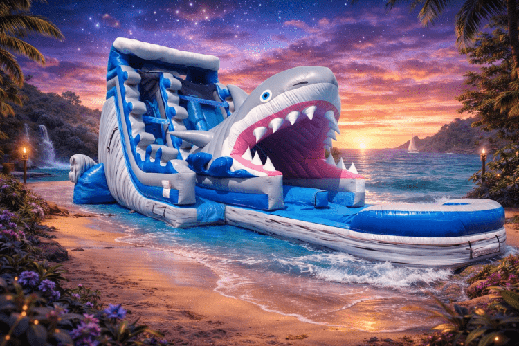 Dive into the ultimate thrill of the "20 ft Jaws Attack Wet/Dry Slide!" This massive inflatable slide boasts a 20-foot drop that’ll get your adrenaline pumping. Modeled after the legendary great white, its jaws open wide to swallow you into an exhilarating ride. Whether set up for cool splashes or dries मजाया, its versatility ensures fun in any weather. Perfect for parties that want to add a splash of excitement or create a wave of laughter, just climb, slide, repeat – and dodge those jaws!